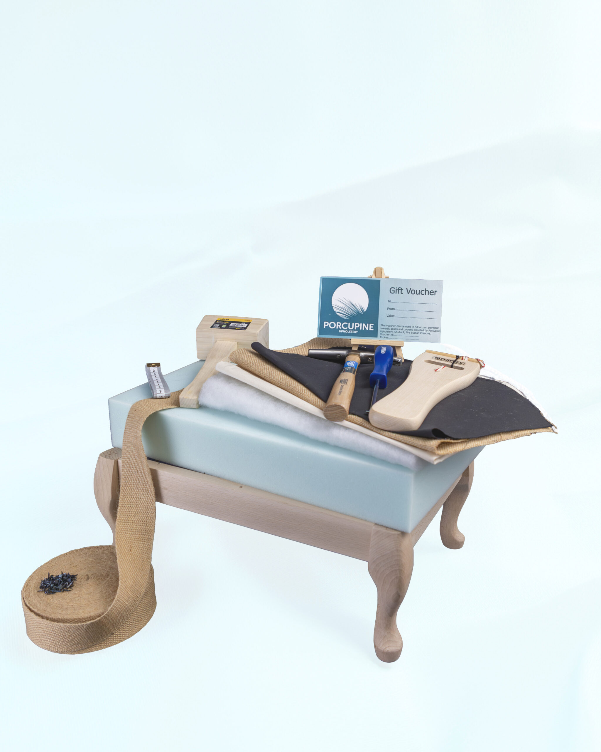 Footstool kit with supplies including webbing, tacks and materials, essential upholstery tools and a tuition voucher to be used to book a class